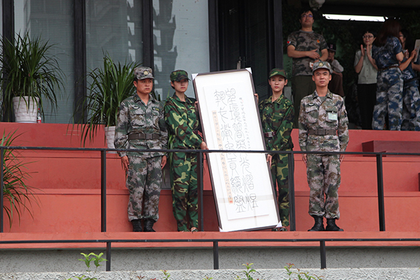 建筑艺术学院罗哲文同学代表全体参训学员发言,她分享了军训生活的感受和收获,并代表全体参训学员向师长和教官们致以了衷心的感谢。在今后学习生涯中,同学们势必会继续发扬在军训中学到的优良品质和干练作风,铸造超世之才、磨炼坚韧之志,驰骋天宇,劳作沉思,无愧于师长教诲和青春梦想。学生代表还向教官代表赠送了由学生创作的书法作品。