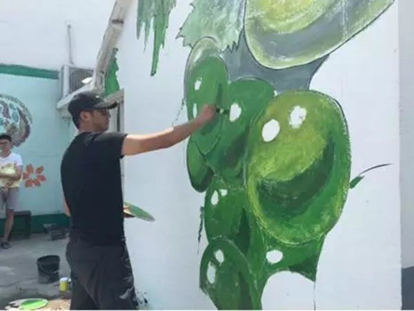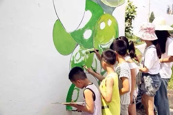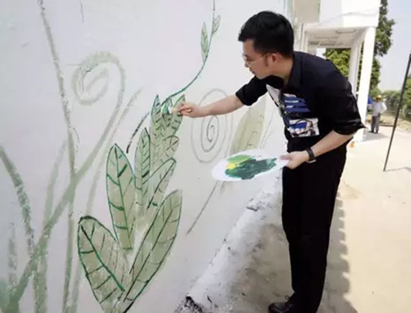 图为团员青年们在墙绘,并把美的种子播种在乡村孩子的心中