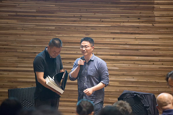 宣传部副部长王益老师向陈晓卿导演赠送许江院长亲笔签名的画册