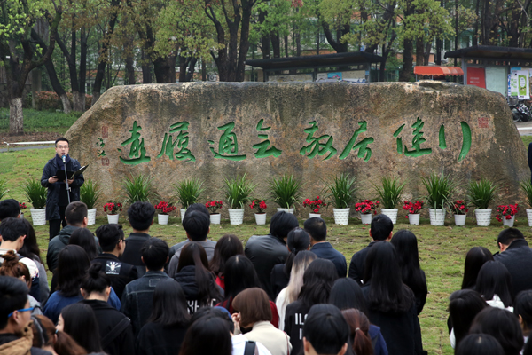 在校训发布仪式的现场,一块重达一百吨的巨石耸立在草坪上,石上镌刻着苍劲有力的“行健居敬会通履远”八字校训,碧绿色的字与这座有着浓郁湖山精神的山水家园交相辉映。从此以后,这八字校训和这块巨石,将伴随着莘莘学子们一同感受着鱼跃莺飞的春光、蝉鸣雀跃的夏日、斑驳剪影的秋叶、隽远皑皑的冬雪,在这湖山望境中养育身心、磨练成长。