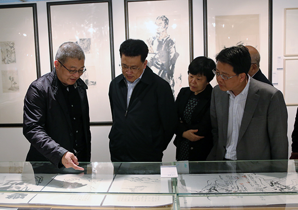 会议开始前,袁家军一行在我院党政领导钱晓芳、许江的陪同下参观了“大学望境——中国美术学院建设世界一流大学十周年特展”, 许江通过展览着重向袁家军介绍我院近十年在社会服务、主题创作、立德树人等方面的做法与成果。