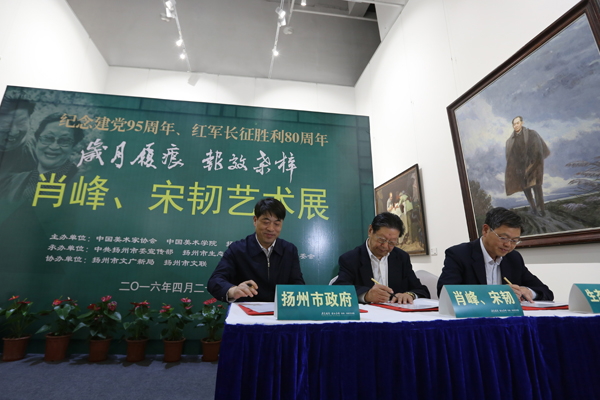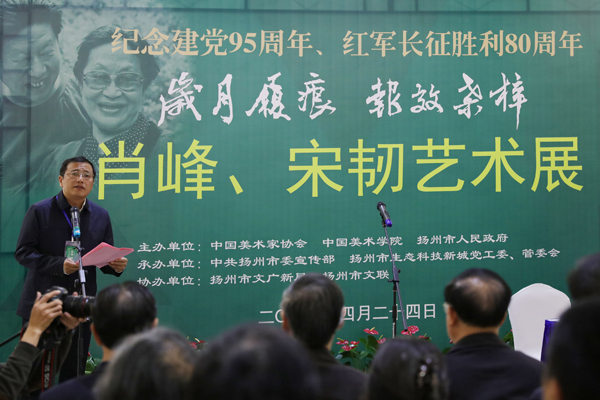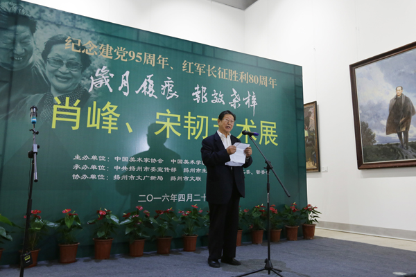 2016年4月24日下午3点,“岁月履痕 报效桑梓”——肖峰、宋韧艺术展在扬州开幕。参加开幕式的嘉宾有原浙江省委常委、原省军区政委马以芝,原浙江政协副主席张蔚文,原江苏省人大副主任丁解民,原江苏省政协副主席、原南京艺术学院院长冯健亲,原中国美术家协会副主席、原中央美院院长潘公凯,中国美术家协会副主席、中国美术学院院长许江,中国美术学院副院长王赞,中国美术学院副院长高世名,中国美协理论委员会主任、中央美院教授邵大箴,原中国美术学院副院长孟云生,辽宁省美协主席宋雨桂,浙江省文联副主席马锋辉,原浙江美术学院院长莫朴之子、著名画家莫大林先生,中国美术学院教授、著名书法家王冬龄,以及中国美术学院教师代表们等。中国文联副主席、中国美术家协会主席刘大为发来亲笔贺信,祝贺肖峰宋韧展览成功。中央文史研究馆副馆长、中国文联副主席、中国美术家协会副主席冯远昨日在肖峰、宋韧老师的陪同下参观了展览。开幕式由扬州市委常委、宣传部长陈鍇竑主持。