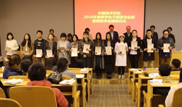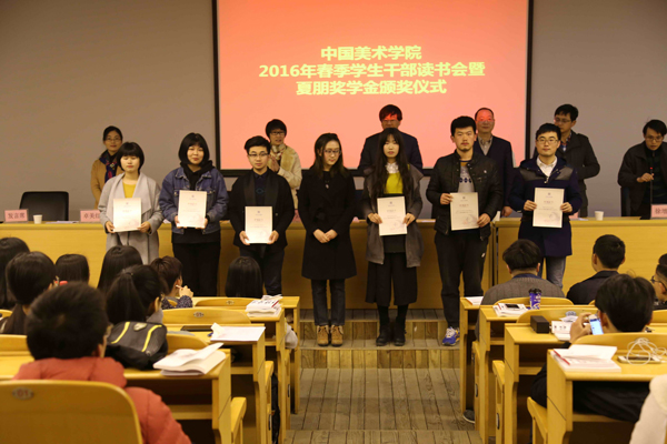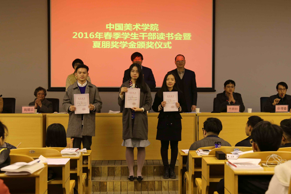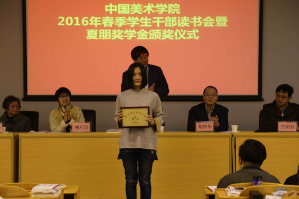 学工部部长竺照轩首先宣读了2016年夏朋(姚馥)奖学金优秀学生、先进集体名单,随后进行了表彰。孙熠琮、李明键、王程程、荆可雅、李朝林、徐曦、骆晨琪、吴丹、蔡雪琼、毛湘昳、谢庭苇、李斯言、李海亮、沈源源、沈玲芳等15位同学荣获夏朋(姚馥)奖学金优秀学生,绘画艺术学院2014级版画班、雕塑与公共艺术学院2013级城市雕塑第一工作室设计艺术学院2013级染织班、手工艺术学院2013级陶艺1班、建筑艺术学院2014级建筑2班、上海设计学院2014级平面设计2班等6个集体荣获夏朋(姚馥)奖学金先进集体。学生代表绘画艺术学院王程程代表获奖学生发言。