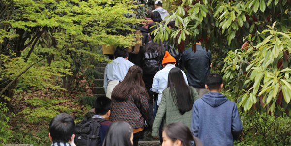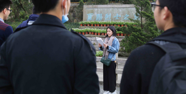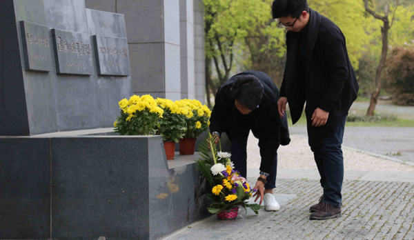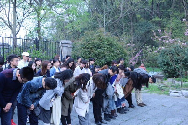 清明将至,读书会后,师生们以环保毅行的方式从南山校区徒步来到位于莲花峰旁的夏朋烈士墓和潘天寿墓前举行仪式,敬献鲜花,重温校史,缅怀先贤。