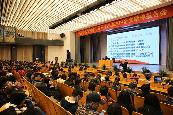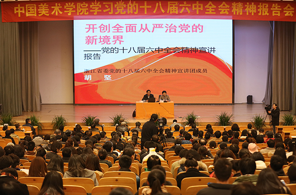 11月25日下午,我院召开学习十八届六中全会精神报告会,省委党的十八届六中全会精神宣讲团成员、我院思政特聘教授、原省委宣传部常务副部长胡坚作题为《开创全面从严治党的新境界》的专题报告。报告会设象山校区2号楼小剧场主会场,南山校区学术报告厅、上海设计学院两个分会场同步直播。我院党政领导班子成员钱晓芳、胡钟华、孙旭东、刘正、应达伟、徐国强和全体中层干部、全校师生党员、民主党派负责人、离退休党员共1200余人听取报告会。报告会由党委书记钱晓芳主持。