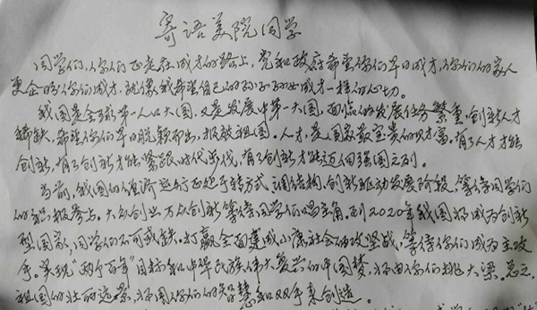 郝龙清(右)现年86周岁,1945年入伍,1947年入党。他曾参加过抗日战争、解放战争、抗美援朝战争,立过二等功一次,三等功三次,四等功一次,解放朝鲜军公章一枚。在新中国成立后不久,又成为中国空军一级飞行能手、一级投弹能手、一级射击能手。在这次晚会的两天前,得知要给美院同学做一次演讲,郝龙清爷爷亲自写了这篇“寄语美院同学”。字字深情!
