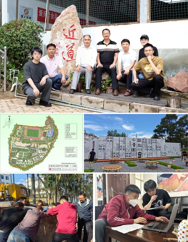 支教团本着经济实用、因地制宜的原则,积极协助景东职中推进校园绿化美化建设,优化育人环境,开展“人文山水,绿美校园”行动计划。从美化学校边角空间入手,对校园边角绿地资源再发掘,设计游憩花园、安置文化石碑、校园文化展示架、打造银生十景“实训+美育”艺术空间……旨在营造一个功能完善、特点鲜明并具有一定美学价值的公共“花园”。
