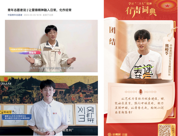 支教团成员熊峻苓成为校党的二十大精神青年骨干宣讲员,参与浙江省理论宣讲服务平台“宣讲在线”、杭州市委网信办“有声词典”等线上宣讲活动,获评中国美术学院“优秀共产党员”荣誉称号,入围“学习二十大、永远跟党走、奋进新征程”全国青年演说大赛百强,获优胜奖。