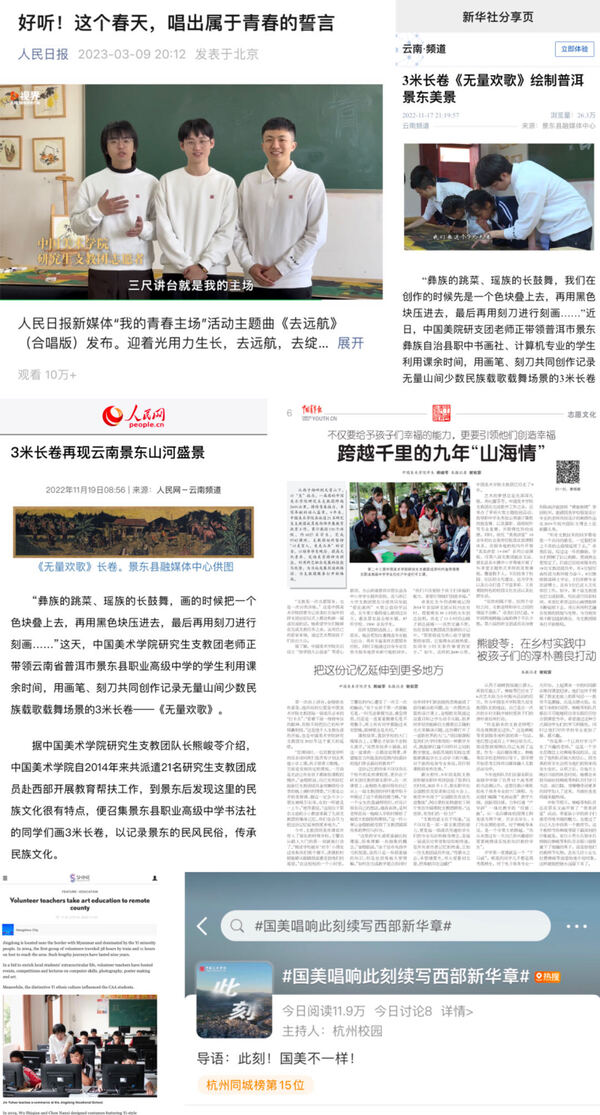 一年来,本届支教团积极开展校园、社区文化建设工作,为景东学子打造出众多丰富多彩、又具有美院特色的民族文化活动,受到各主流媒体的广泛关注。《跨越千里的九年“山海情”》在中国青年作家报2022年10月18日06版获得整版报道,《把这份记忆延伸到更多地方》、《熊峻苓:在乡村实践中被孩子们的淳朴善良打动》两篇文章收录于大学生志愿服务西部计划-中国青年网的“志愿感悟”和“人物风云”板块中。相关报道累计登上微博热搜1次,获得人民网、新华社、人民日报、共青团中央等国家级媒体报道46次,云南青年志愿者、青春浙江、浙江卫视、上海日报、杭州志愿者等省市级其他媒体报道107次。“美景携手,艺美无量”以艺术力量助力教育扶贫志愿服务项目荣获云南省第三届新时代文明实践志愿服务项目大赛普洱市银奖,这既是对本届支教团开展志愿服务工作的充分肯定,也是中国美术学院实践育人成果的又一集中体现。