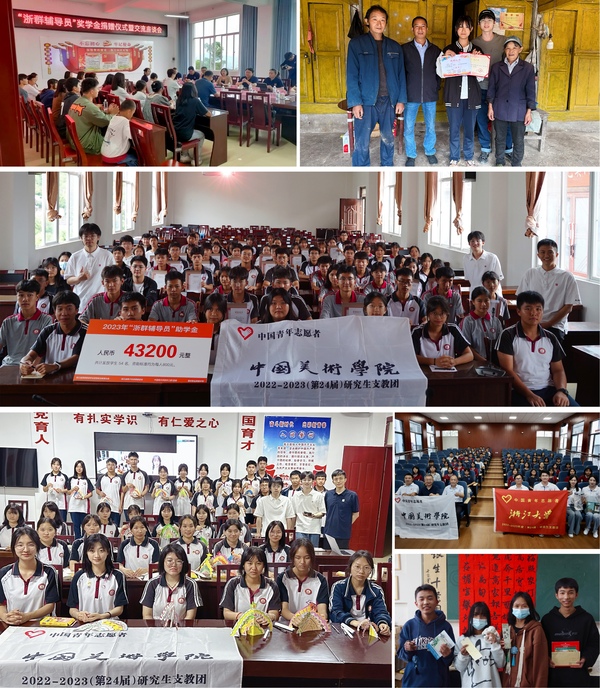 为更好地促进乡村振兴和教育发展,本届支教团积极参与普洱市“青志建功”西部计划志愿者助力乡村振兴行动工作,每位成员结对3名家庭贫困学生;同时联合中国美术学院青年志愿者协会在云南景东彝族自治县开展“和言”美育助学计划;与浙江大学研究生支教团景东分团联合开展“爱在滇西”公益助学活动,为景东县各中小学学生提供资助,并将浙江大学、中国美术学院优质课程资源引入服务地,持续开展“东课西送”活动;协助浙江省思政教育分会在职中设立首批“浙群辅导员”奖助学金,获得捐赠18.56万元,创造了东西部校地对口合作的生动案例,创设了思政育人和以美扶智的真实现场。