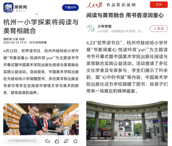 2023年5月12日,“我的书屋我的梦”主题绘画展与阅读美育研学活动在中国美术学院南山书屋•象山之家阅读空间举行。展览以娃哈哈小学学生笔下五彩斑斓书屋为代表的“我的书屋•我的梦”主题创作作品,展示了孩子们共同的美好愿望。校资产公司支部党员指导小学生用画笔描绘美好的画面、徜徉在知识的海洋里,大手拉小手,交织成梦的支点、勾连梦想与现实,成为春暮夏浅时节象山校园美境里一道靓丽的风景线。活动紧扣立德树人根本任务,把深入开展学习主题教育与出版社优秀传统文化出版成果转化、小学思政课堂、大学生志愿服务活动相结合,融展览、阅读美育、写生研学等多角度的让同学们全方位感受阅读的力量,体验阅读的快乐。活动受到了新华社、人民日报、浙江日报潮新闻、浙江电视台中国蓝新闻等央媒、省媒的关注与持续报道。