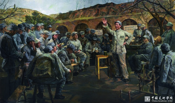 党中央为了统一全党思想,争取抗日战争的胜利,领导全党进行了整风运动,这是党历史上第一次大规模的整风运动。1945年,党的六届七中全会讨论并通过了《关于若干历史问题的决议》,标志着延安整风运动的胜利结束。作品描绘了毛泽东在延安整风运动时期深入无产阶级和群众之中,为中国共产党新吸收的一大批农民和小资产阶级入党分子进行讲演,集中开展了一场马克思主义思想教育运动的场景。