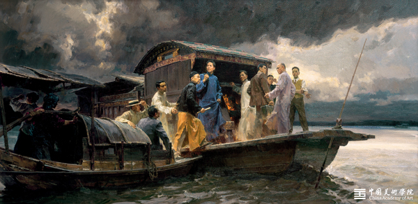 1921年7月23日,中国共产党第一次全国代表大会在上海召开,最后一天的会议转移到浙江嘉兴南湖举行。一大的召开标志着中国共产党的正式成立,从此中国革命的面目焕然一新。作品采用写实的手法,再现了中共一大南湖会议的历史瞬间:毛泽东、董必武、何叔衡、张国焘、李达等代表正准备登船。身后是汹涌不安的湖面,远处东方的曙光在蔽日的乌云中透出缕缕阳光,历史情节与历史人物生动浮现。画面中,毛泽东身着青色长衫,手提衣摆,肩挎包袱,昂首疾步走向船头,意气风发的神态,使他成为人物组群的视觉焦点,船工正用力把船撑离码头,象征了革命航船即将启航。
