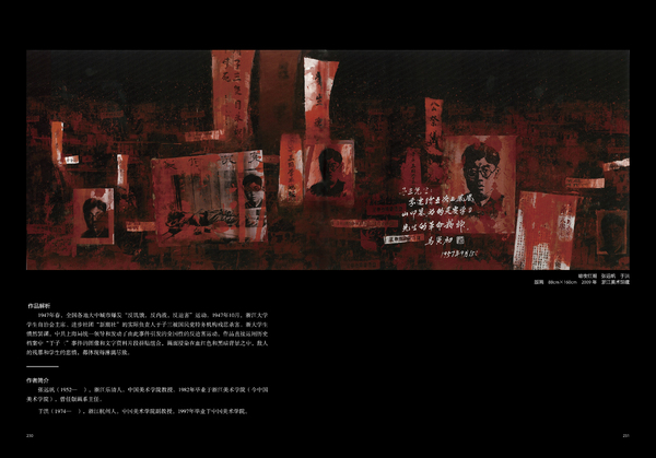 1947年春,全国各地大中城市爆发“反饥饿,反内战,反迫害”运动。1947年10月,浙江大学学生自治会主席、进步社团“新潮社”的实际负责人于子三被国民党特务机构残忍杀害。浙大学生愤然罢课。中共上海局统一领导和发动了由此事件引发的全国性的反迫害运动。作品直接运用历史档案中“于子三”事件的图像和文字资料片段拼贴组合,画面浸染在血红色和黑暗背景之中,敌人的残暴和学生的悲愤,都体现得淋满尽致。