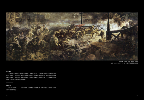天津战役是著名的平津战役中最紧张、最激烈的一仗,天津的解放为北平的和平解放创造了有利条件。作品反映了人民解放军在夜幕下与敌人展开激战的情景。宽银幕式的构图更好地展开画面、表达主题。燃烧的装甲车一方面巧妙地成为夜战的光源,一方面和前景的士兵实体一起凸显出战斗的激烈和残酷。