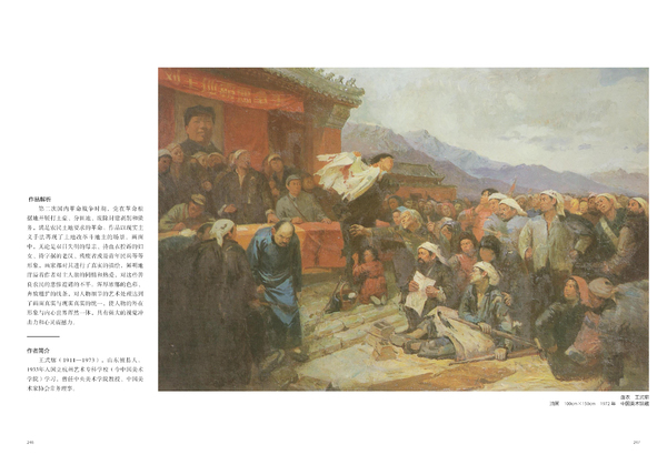 第二次国内革命战争时期,党在革命根据地开展打土豪、分田地、废除封建剥削和债务,满足农民土地要求的革命。作品以现实主义手法再现了土地改革斗地主的场景。画面中,无论是双目失明的母亲、持血衣控诉的妇女、持字据的老汉、残废者或是青年民兵等形象,画家都对其进行了真实的描绘,鲜明地洋溢着作者对主人翁的同情和热爱,对这些善良农民的悲惨遭遇的不平。浑厚浓郁的色彩、奔放粗犷的线条,对人物细节的艺术处理达到了画面真实与现实真实的统一,使人物的外在形象与内心世界浑然一体,具有强大的视觉冲击力和心灵震撼力。