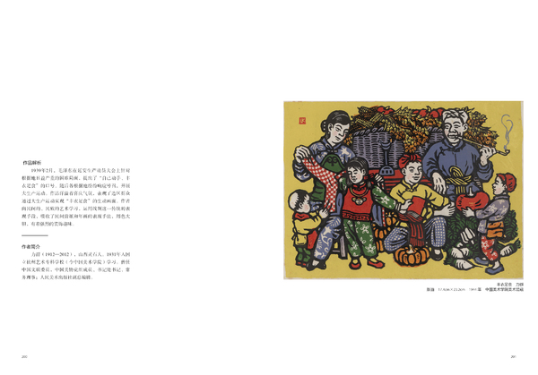 1939年2月,毛泽东在延安生产动员大会上针对根据地日益严重的困难局面,提出了“自己动手、丰衣足食”的口号。随后各根据地纷纷响应号召,开展大生产运动。作品洋溢着喜庆气氛,表现了边区群众通过大生产运动实现“丰衣足食”的生动画面。作者向民间的、民族的艺术学习,运用线刻这一传统的表现手段,吸收了民间剪纸和年画的表现手法,用色大胆,有着强烈的装饰趣味。