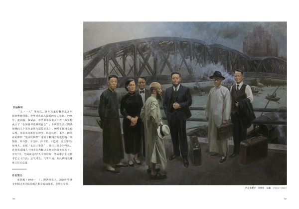 “九 · 一八”事变后,日军迅速控制华北并不断向华南侵蚀,中华民族陷入深重的存亡危机。1936年,沈钧儒、邹韬奋、章乃器等知名人士在上海发起成立了“全国各界救国联合会”,并联名发表《团结御辱的几个基本条件与最低要求》,阐明了救国会的宗旨,要求各党派停止冲突,联合抗日。未久,国民政府即以“危害民国罪”逮捕了救国会的沈钧儒、邹韬奋、章乃器、李公朴、沙千里、王造时、史良等7位领导人,史称“七君子事件”。事件引发全国哗然,在各界爱国人士的多方营救以及舆论的强大压力下,翌年7月,当局被迫将7人全部释放。作品中沪上七君子伫立于江边,意气风发,写实生动,灰色调的处理极具历史意蕴。