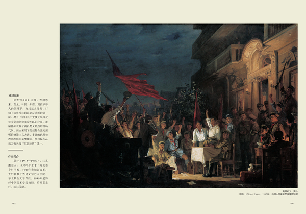 1927年8月1日2时,在周恩来、贺龙、叶挺、朱德、刘伯承等人的领导下,南昌起义爆发,打响了武装反抗国民党反动派的第一枪,揭开了中国共产党独立领导武装斗争和创建革命军队的序幕。此幅作品表现了南昌起义热烈的现场气氛,画面采用了类似舞台强光照明的浪漫主义方法,丰富的色调处理和准确的造型能力,使这幅作品成为著名的“红色经典”之一。