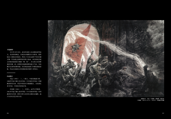 1911年10月10日,武昌革命党人发动湖北新军起义,各省纷纷响应,形成全国规模的辛亥革命,最终结束了清政府的统治,终结了中国长达两千年的封建王朝。作品通过表现革命的战斗场面,来反映武昌起义打响的结束清王朝的"第一枪"。冲天的火光和鲜艳的红旗,进一步烘托出枪林弹雨的战斗气氛。为表现历史事件的厚重感,作品刻意加强了环境氛围的渲染。作品为国家重大历史题材美术创作工程项目。