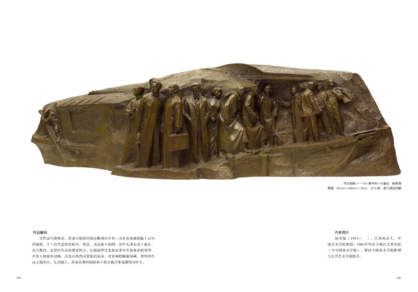 该作品气势恢宏,作者以精湛的技法雕刻出中共一大正在南湖游船上召开的场景。十三位代表依次排开,体量、动态各不相同。青年毛泽东站立船头,高大醒目,是整组作品的视觉焦点,向前遥望之态象征着对革命事业的展望。中景人物富有动感,营造出热烈而紧张的氛围。背景渔船略做刻画,使整件作品主题突出,生动感人,将观众带回那段艰辛而又饱含革命激情的岁月。