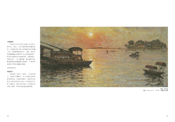 1921年7月中国共产党第一次全国代表大会在上海举行,最后一天为了躲避租界巡捕的追查,会议移至距上海不远的浙江嘉兴南湖上的一只游船里继续进行。由此,风景优美的南湖成为中国共产主义革命的摇篮。作品以南湖旭日为表现对象,水波潋滟,风和日丽,一片宁静温馨。细心描绘的红船笼罩在旭日暖暖的红色调中,不动声色地突出了革命圣地的崇高感。