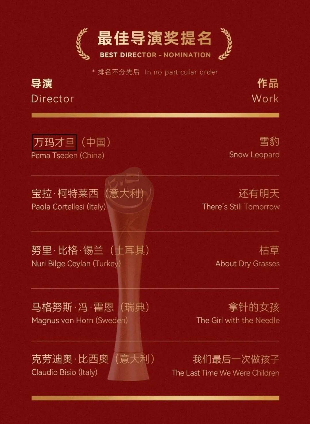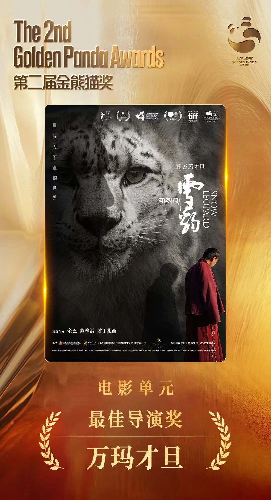 第二届金熊猫奖于9月13日在成都揭晓,中国美术学院电影学院教授、博士生导师万玛才旦导演凭借遗作《雪豹》获得最佳导演奖。《雪豹》剧组主创(部分)久美成列、德格才让、才丁扎西、王磊、万军等参加颁奖典礼。