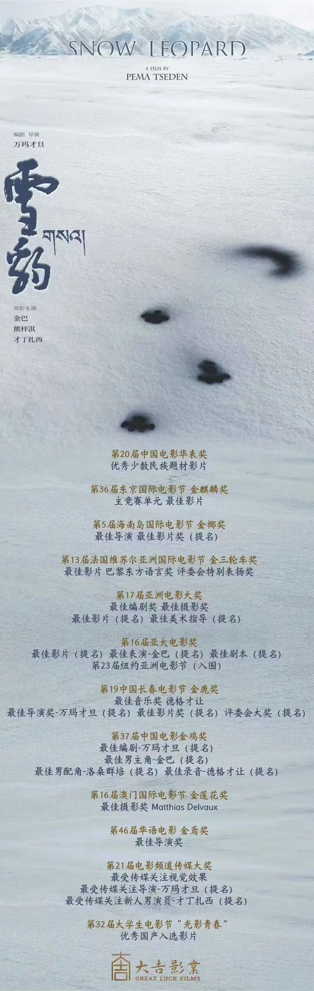电影《雪豹》曾入围2023年第80届威尼斯国际电影节,第48届多伦多国际电影节,荣获2023年第36届东京国际电影节主竞赛单元最佳影片“金麒麟”大奖,第5届海南岛国际电影节最佳导演奖,2024年第30届法国维苏尔亚洲国际电影节最佳影片金三轮车大奖、巴黎东方语言奖、评审团特别表扬奖3项大奖,第17届亚洲电影大奖最佳编剧、最佳摄影奖,第26届上海国际电影节电影频道传媒大奖最受传媒关注视觉效果奖,第19届长春国际电影节“金鹿奖”最佳音乐奖,第20届中国电影华表奖优秀少数民族题材影片奖。