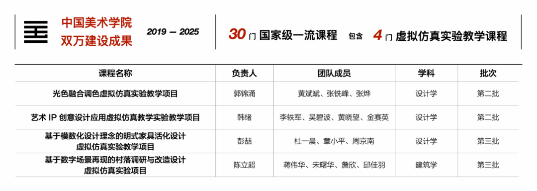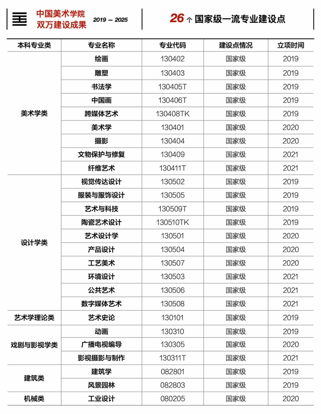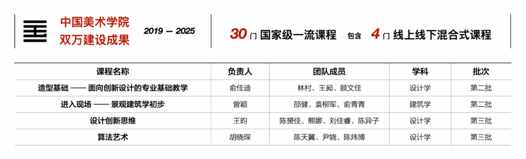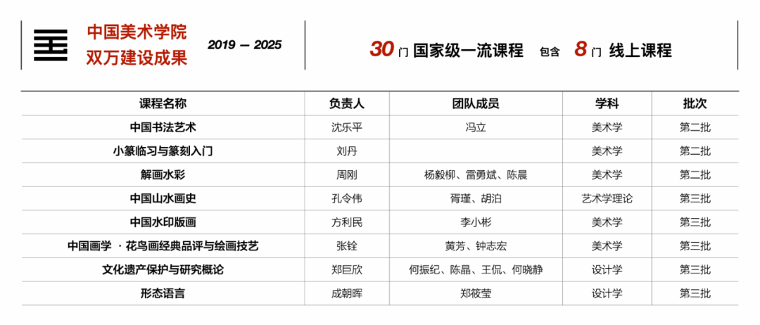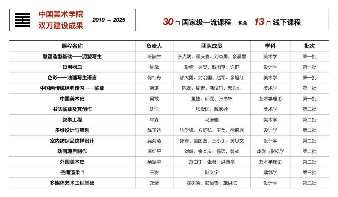 自教育部 2019 年启动本科“双万”建设计划以来,中国美术学院积极响应,深入推进“新文科”建设要求,科学布局本科专业建设点和课程培育工作。学校28个招生专业中,已有26个获批国家级一流本科专业建设点,2个获批省级一流本科专业建设点,充分彰显了专业建设的卓越成效。近日,教育部公布了《关于第三批国家级一流本科课程认定结果的公示》,我校再创佳绩,新增11门国家级一流课程,涵盖四个类别,其中线上课程5门,线上线下混合式课程2门,线下课程2门,虚拟仿真实验教学课程2门。至此,中国美术学院的国家级一流课程数量已达30门,在全国艺术类高校居首位。这一成绩的取得,彰显了中国美术学院在本科课程建设方面的卓越成效与深厚积淀。