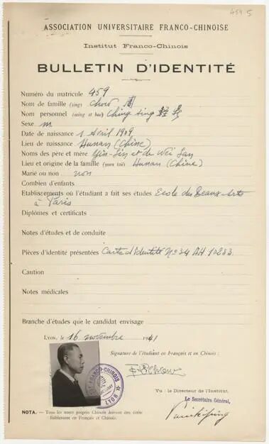 周轻鼎里昂时期中法大学身份卡,1941年起,里昂市立图书馆中文部,中法大学文献藏档[A459]-5(由里昂第三大学托管),里昂市立图书馆拍摄