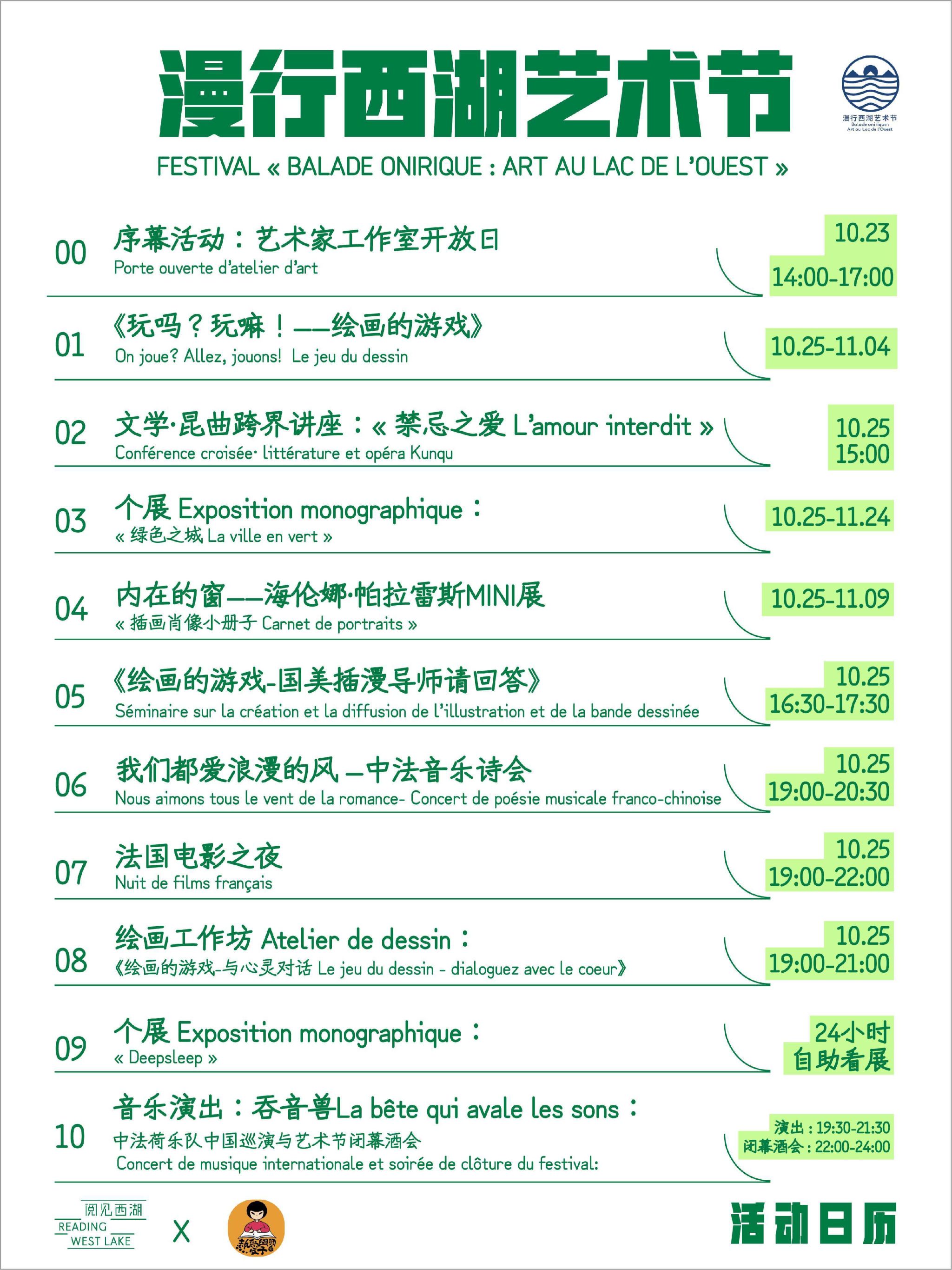 本次活动的灵感来自法国巴黎一年一度的“白夜”(Nuit Blanche)。在特定的一个活动日中,巴黎全城会有上百处场所通宵举行艺术活动,共同为市民和游客奉献在艺术中狂欢的不眠之夜。活动自诞生至今已有近半个世纪的历史,在全球范围内有极大的影响力。而在金秋的杭州城,“慢行西湖艺术节”以中法文化互动的形式首次将这类活动带到杭州。十几位从法国远道而来的艺术家们在西湖边驻地创作,在艺术的语境中认识杭州、喜爱杭州,同时他们也以艺术的语境与杭州本地的艺术人文工作者们一起,为观众呈现了包括个展、工作坊、讲座、音乐会、双语诗歌朗诵会、电影人分享会等丰富多彩的艺术文化盛宴。
