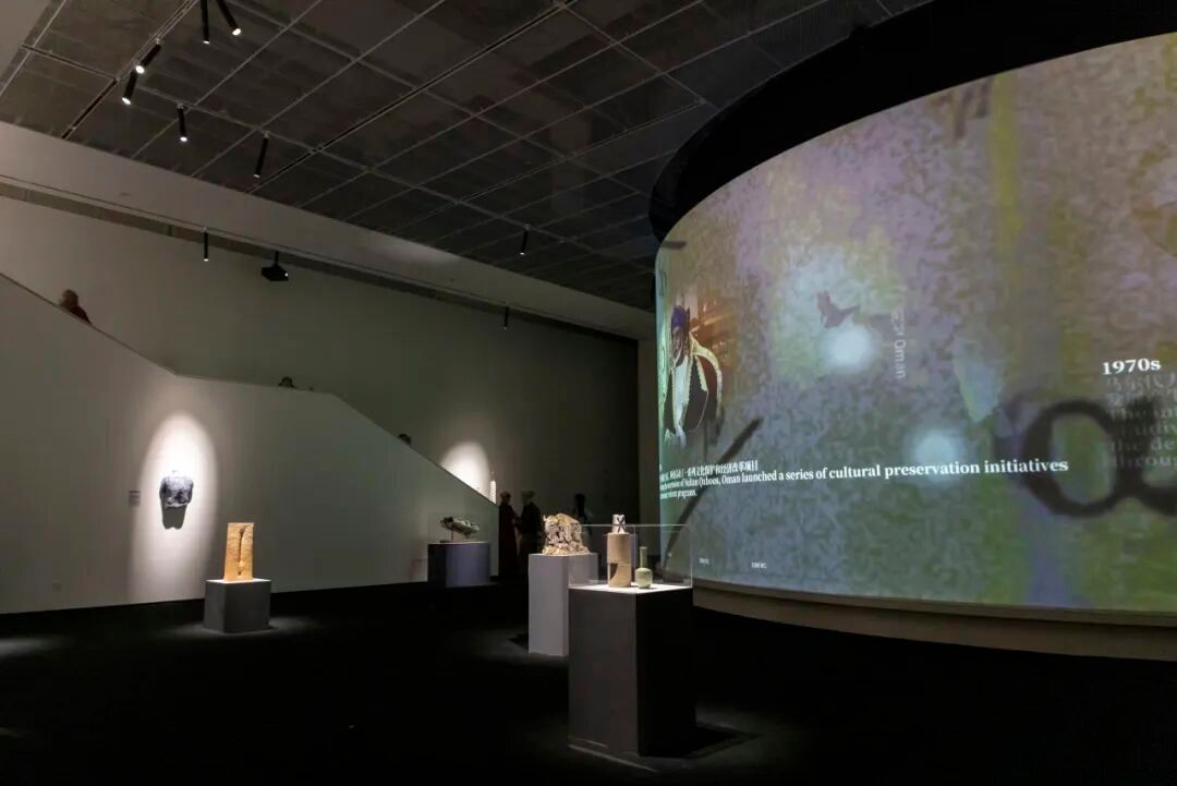 在本次展览中,展厅中央的环形投影所呈现的三条“航线”,投影画面是中国美术学院手工艺术学院设计艺术学系师生郑巨欣老师和何晓静老师带领同学们共同创作的亚洲工艺思想研究。航线的时间轴从公元前的几千年一直到今天,作品分为纤维、金工、陶瓷这三种亚洲领域典型的手工艺的历史、重要事件和代表。内容分为三条主线:第一个以时间为线索,呈现从公元前到近代、现代、当下亚洲手工艺的发展历史。第二条线索是空间,聚焦亚洲47个国家和地区的手工艺整体状态,择取最能代表国家精神和气质的手工艺呈现。第三个线索是事件,从不同手工艺门类,如陶瓷、染织等角度,从它们如何成为世界文化遗产的角度,呈现整体世界。
