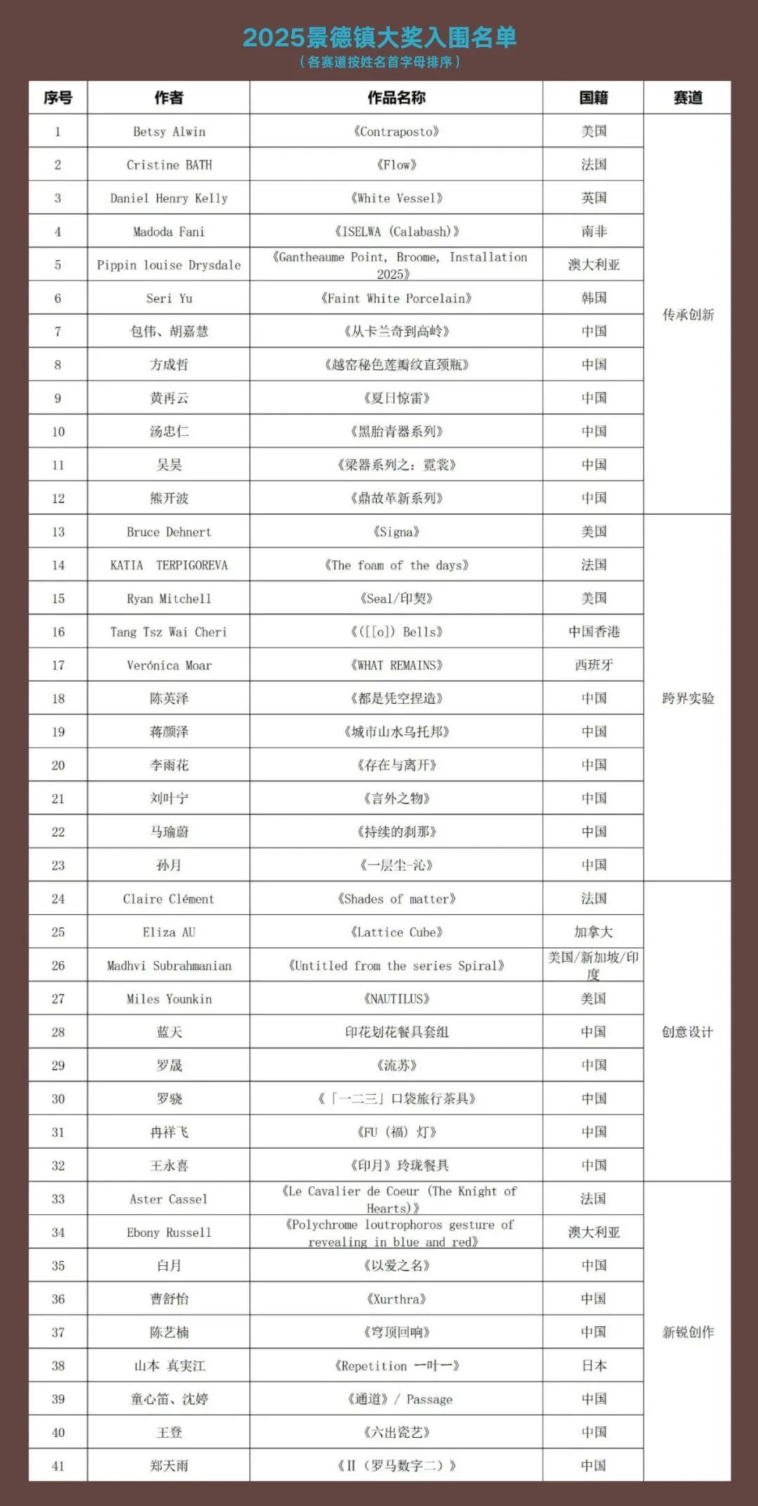 本届大奖致力于表彰兼具艺术视野与创新精神、传承精湛陶瓷工艺且彰显独特创作语言的杰出作品,鼓励创作者以当代视角重新诠释陶瓷艺术传统,推动陶瓷工艺在跨文化语境下的融合与突破,展现陶瓷艺术对当下文化发展的重要贡献。大奖共设「景德镇大奖」「传承创新奖」「创意设计奖」(文创方向、工业方向)、「跨界实验奖」「新锐创作奖」五大奖项,共征集来自全球六大洲55个国家及地区的投稿作品1325 件(组),并由19位专家学者组成甄选委员会,通过匿名评审遴选出41件入围作品,评审过程严格遵循学术规范与程序公正,确保评选的专业性与国际性。