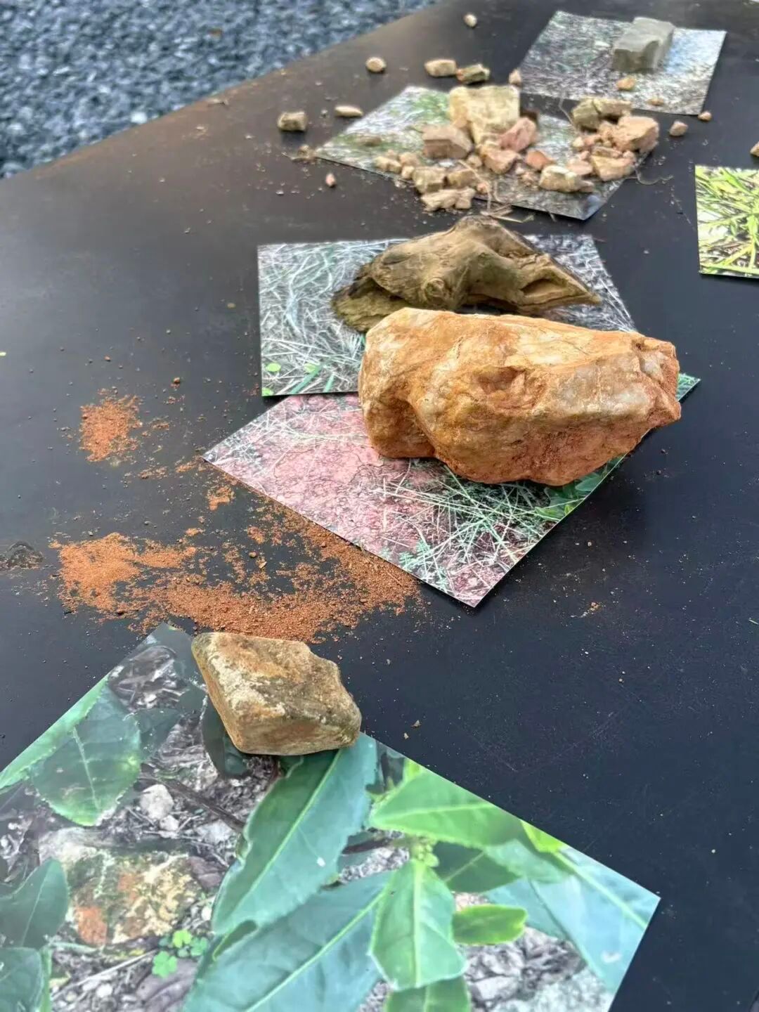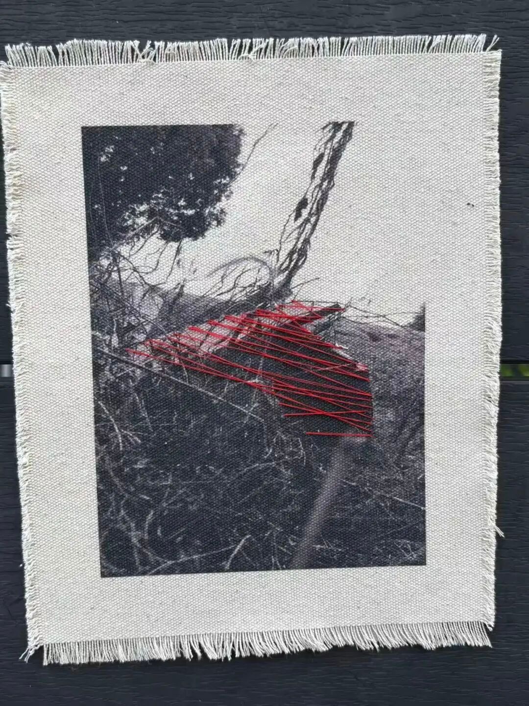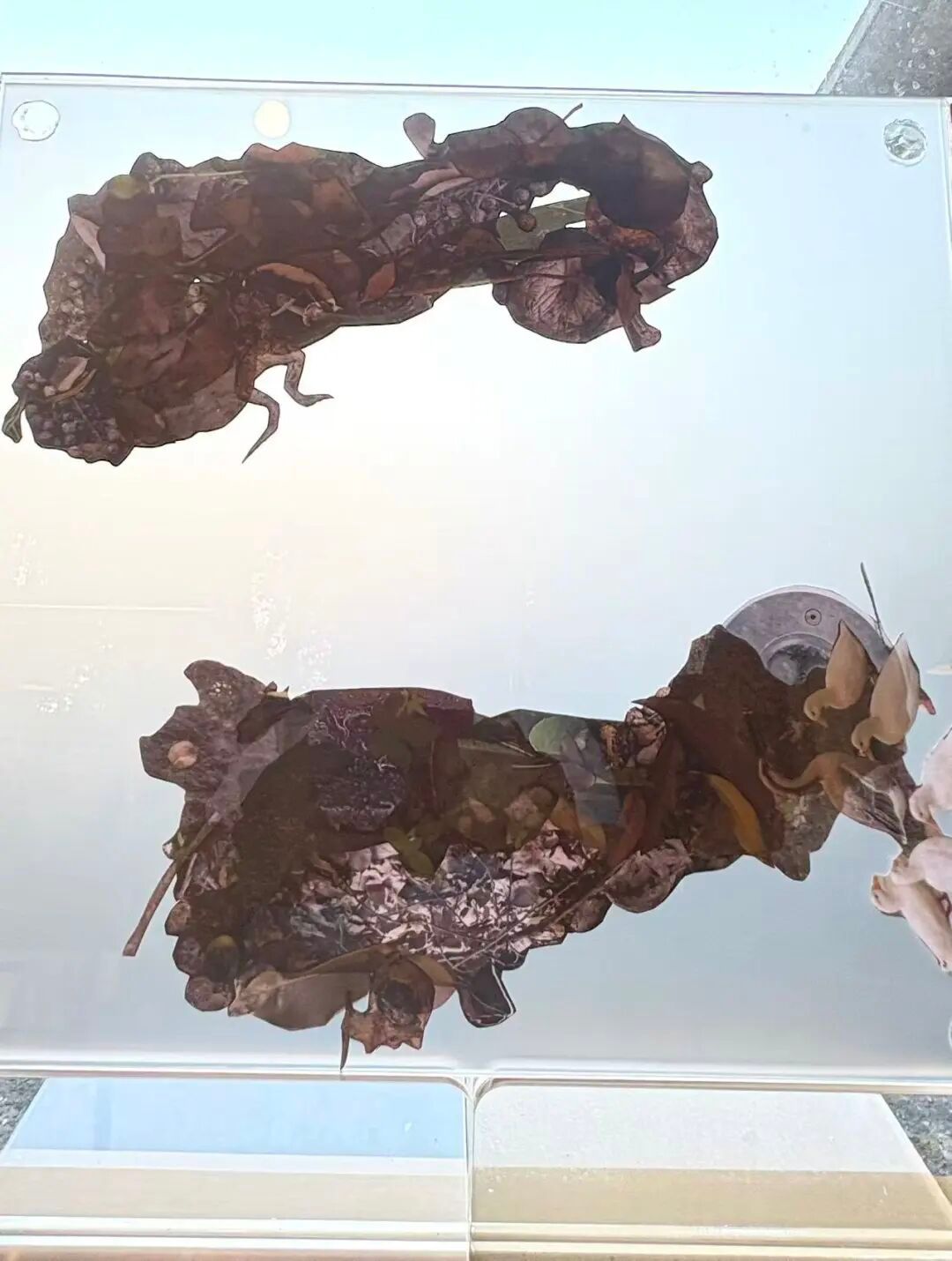 这件拼贴作品,试图捕捉一个静谧而容易被错过的瞬间。我们常常匆匆掠过树荫,却未曾留意其下隐藏的整个世界——一片落叶、一枚落果、一块斑驳的树皮,或是被人遗落的小物。它们是光影的碎片,是休息时光的见证。将这些被忽视的“躲在树荫下的物体”收集、裁切,重新拼接成一对在阴影中休息的脚印。它邀请观众俯身欣赏,在破碎的阴影中发现完整,在大树遮蔽处,寻见一处属于自己的阴凉歇息处。