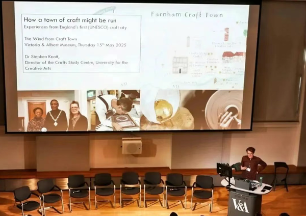 英国工艺研究中心总监斯蒂芬·诺特博士在V&A的论坛现场分享英格兰首个工艺城市的实践经验——一个工艺之城如何运作。法纳姆作为英格兰首个获得“世界工艺之城”称号的城市,展示了制度如何与社区协作共同构建可持续的文化生态。通过手工艺月、驻地项目等多机构合作的机制,法纳姆形成了可复制、可传播的文化治理模式,提供了地方如何借助文化机制进行“软实力建构”的地方范式。