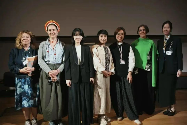 演讲嘉宾合影:从左到右分别是英国萨塞克斯手工艺周主席Jessica Wood女士、英国资深工艺策展人和Newlands House Gallery总监卢西亚·马诺普鲁博士、策展人和国际工艺创新机构环流GyreCraft联合发起人卢川、陶瓷研究学者和香港逸乐画廊联合创始人黄海瑛女士、V&A中国馆藏策展人李晓欣博士、伯明翰城市大学珠宝学院学科主任丽贝卡·斯基尔斯、飘雅活艺创意总监陆咏沁