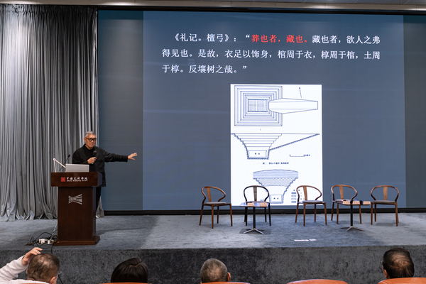 本次讲座聚焦于擂鼓墩与马王堆两座墓葬。巫鸿教授首先解释了“椁墓”与“藏”的概念,指出中国古代椁墓体系具有独特的空间逻辑,通过深掘地穴构建封闭性墓室,将棺椁及随葬品系统性地“藏”于地下,形成生者与逝者严格分离的二元空间格局。这种深埋实践不仅体现了中国传统生死观中对“幽冥异界”的认知,也与当代艺术中的观念有相似之处。
