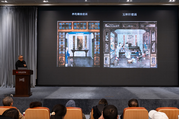 谈及倦勤斋,巫鸿教授将其描述为乾隆皇帝为自己构建的一座微型宫殿,是其理想退休生活的具象化表达。倦勤斋的空间设计从大殿起始,逐渐过渡到更为私密的区域,屋顶呈现蓝色,殿内宽敞明亮,真假门窗交错排列,令人难辨虚实。室内的一面贴墙镜子实则是一扇隐秘的门,开启后可进入设有两个宝座的小剧场,剧场内的壁画描绘了篱笆、栅栏等元素,延伸至舞台后方,营造出演员从画中走出的奇幻视觉效果,充分展现了乾隆皇帝对艺术、文学、戏剧和音乐的融合运用,构建出一个充满想象力的幻想空间。巫鸿教授认为,通过镜子进入这一奇幻世界,不仅可以深入探究乾隆皇帝的个人想象与审美趣味,也为从更宏观的视角讨论全球艺术史的相关议题提供了一个独特的切入点。