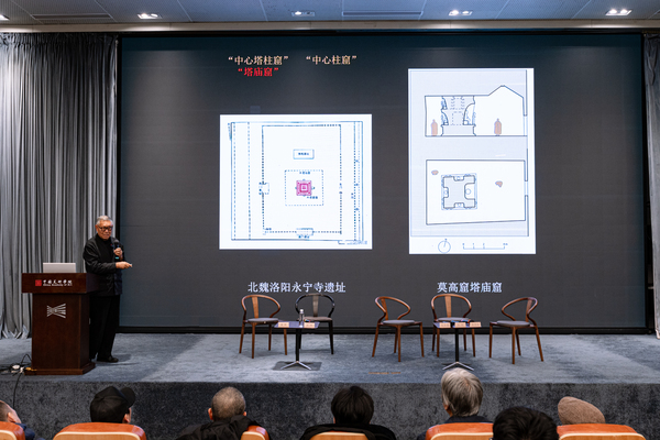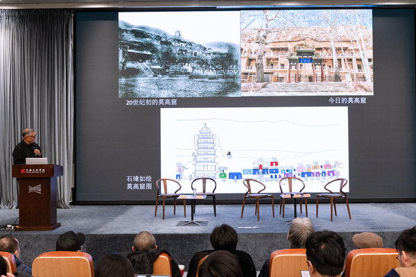 巫鸿教授回顾了前一日讲座内容,指出本次三场讲座围绕三个时刻和历史情境展开,而敦煌莫高窟作为一个全新的总体空间,其意义在僧人或和尚的进香与参禅活动中得以体现。巫鸿教授认为,除了依据朝代史分期的线性叙述方式,还可以从空间框架角度讲述敦煌故事,因为莫高窟在不同时期展现出不同面貌,研究时应关注其空间特性而非急于抽象为线性历史。他引用鲁道夫·阿恩海姆的观点,强调空间在美术史研究中的重要性,空间是感知与理解的基础,研究应聚焦于客体系统间的关系。