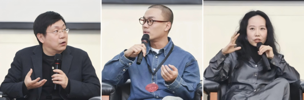 贾玺增以品牌叙事入手,阐述了图案叙事在品牌与消费者之间建立情感纽带的有效性。他指出,优秀的叙事设计能够提升产品的市场竞争力,呼吁设计师始终坚持以人为本、以故事为魂。夏乔伊关注身份认同与文化记忆,强调个人创作中的地域性表达。他通过融合纺织材料与拓片技艺,创造出既充满当代感又蕴含历史厚度的作品,以此回应全球化背景下人们对自身文化归属感的复杂心理。周周从自己的创作实践出发,分享了通过刺绣媒介实现图案叙事的探索。她的作品富有戏剧性视觉语言,既展现了图案叙事的多样性,也揭示了艺术身份在媒介转换中的重构与拓展。