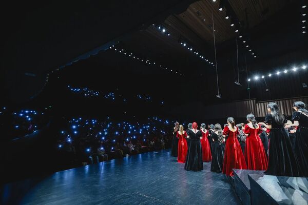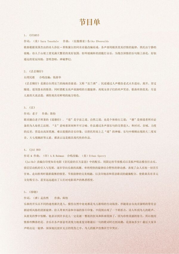 舞台上灯光璀璨,台下更是座无虚席。音乐会以梦幻般的诗性作品《Stars》拉开帷幕,玻璃杯创造清脆动听的音色,配合人声的融合,听众们不禁沉浸其中。伴随着演唱的进行,合唱团带领听众们领略《道德经》的威严神秘,聆听诗人在春日逢雨的哀婉叹息,惊叹声音错位交合产生的乐器拨弦似的奇妙音响,感受异国清晨充满生机活力的盎然气象……当大家唱响芬兰民谣《The Joiku》的终末之音时,全场爆发的热烈掌声,无疑是在向表演者们传达他们最真挚的钦佩与祝愿。音乐会的曲目选自经典之声与现代作品,既有听众们耳熟能详的四川民歌,也有当代中西作曲家的创新力作,每一首作品都经过精心挑选与编排,旨在为观众们呈现一场真正的视听盛宴。
