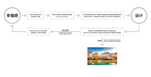 《幸福测量》一书的作者用顺向推证的方式对影响幸福感的变量进行探索,通过建立模型方程并套入不同的权威数据进行计算,证明得出:在大趋势角度,幸福感与幸福感变量之间是呈现规律的量级关系的,且是可以被量化的。而若从逆向角度思考,将以上结论反推便可得出:若幸福变量发生改变,便能够直接的影响到幸福感;而设计就是改变幸福变量的重要途径之一。换句话说,设计行为可以对幸福变量进行干扰,从而达到提升幸福感的目的。