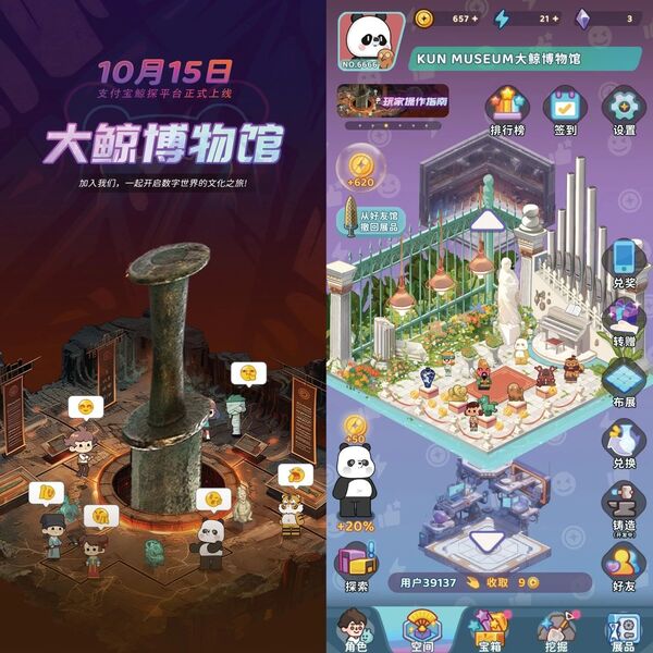《大鲸博物馆》是一款基于支付宝旗下鲸探平台的文物博物馆经营元字宙交互软件。该元字宙空间将传统老字号品牌的经典元素融入博物馆的主题设计中,玩家可以通过虚拟角色在元字宙中游览老字号品牌的历史馆、工艺展示区和文化体验区,参与品牌故事的互动体验。同时元字宙还加入了文物收集、展览等其他传统文化领域的内容,建构了一个具有完整玩法的叙事空间,玩家可以在游戏中挖掘碎片、修复文物,建造经营自己的文物博物馆。