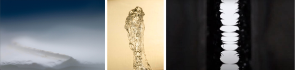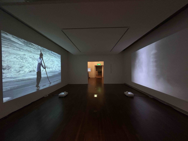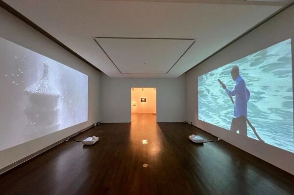 接近尾声,由管怀宾与坂口宽敏带来的两组影像作品,再次组成影像空间。管怀宾作品《流隙》呈现的是一座在水下逐渐消融的佛塔,佛塔由沙土压制而成,伴随着流水的侵蚀物象的形状开始模糊,但隐约可辨。光与黑暗在气泡中交错,静谧中历史与岁月的荒凉感铺面袭来,如同一幕被凝固的历史舞台。而在坂口宽敏作品《帕斯卡的海》中,木枝在浪花涌动的沙滩上一遍遍描摹划下印记,似乎想要将混沌不明的浪迹划清界限,但循环的海浪在下一秒就将印记吞噬。循环、流逝、反复……
