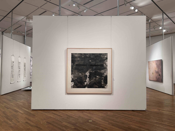 展厅中间,是由四组中日艺术家组成四面背靠背对话的“林壁”,卓鹤君以一幅意向荒芜却气势骇目的浓墨作品《明月出天山,苍茫云海间》将山水之息凝于纸上,画作中间一浓黑飞梁横置于天地之间,将天地划开,亦强势亦神秘,下方有千岩万壑,重汀绝岸。在夜色的云雾中消匿又复现,将山形模糊,将天地覆盖,翻涌间忽现半轮白月,高悬于涛天云浪之中,薄光初现便照亮半山。