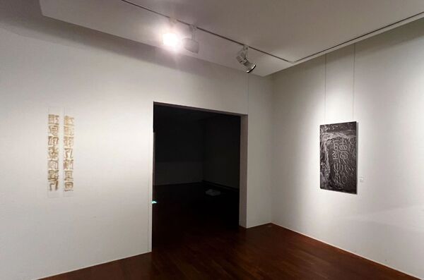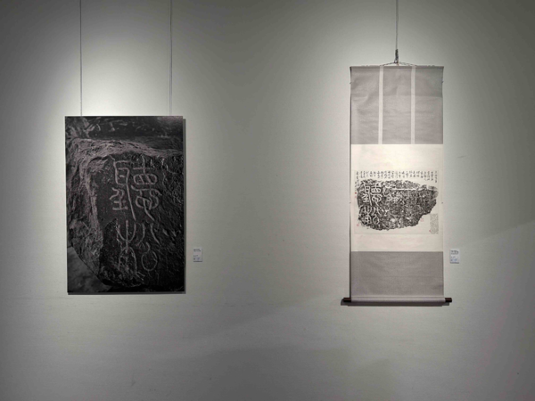 右侧墙面上的两张作品,其内容对象完全一致——来自于唐代书法家李阳冰在惠山寺所书的“听松”石刻。一幅是来自金石学专家许力先生对其完整的手拓,另一幅则来自艺术家塔可先生所摄的“听松”二字摄影作品。前者以古法拓印,后者以摄影术记录,于古今对照间带领我们穿梭至同“空”异“时”的千年前的唐诗之路现场。