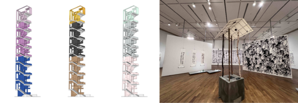 建筑艺术家李凯生在“青山行不尽3:唐诗之路中日艺术家作品特展”的作品上加以进一步推敲,根据天台寒岩的意象,对建筑进行了转化,用结构化的方式构建山水意境。并将建筑模型图纸以传统书画卷轴装裱,在诗性的语言下与形式和维度碰撞。保科丰巳作品《思考之井》擅长于在物质中寻找其内在蕴含的精神,也重视物体自身、空间与人之间的三重关系,是日本后物派极具典型特征的艺术家。