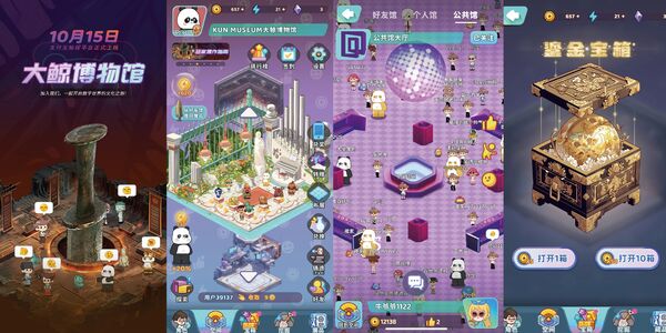 《大鲸博物馆》是一款基于支付宝旗下鲸探平台的文物博物馆经营元字宙交互软件。该元字宙空间将“中华老字号品牌”的经典元素融入博物馆的主题设计中。玩家可以通过虚拟角色在元字宙中游览老字号品牌的历史馆、工艺展示区和文化体验区,参与品牌故事的互动体验。同时,系统中还加入了文物收集、展览等其他传统文化领域的内容,建构了一个具有完整玩法的叙事空间,玩家可以在游戏中挖掘碎片、修复文物,建造经营自己的文物博物馆。