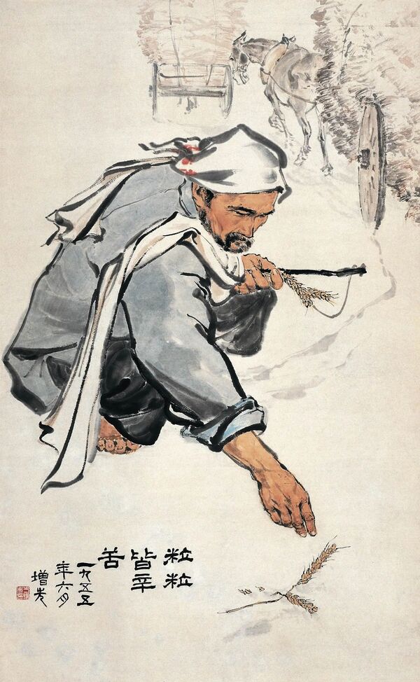 1957年,中央美术学院和中央美术学院华东分院组织师生赴山西永乐宫考察。几年后再一次投入传统壁画的临摹工作中,让画家们更加深刻地认识到,中国传统艺术在表现时代生活、描绘人民大众方面大有可为。他们不仅从传统壁画艺术中找到了中国人物画的源流,发现了其中所蕴含的悠久的现实主义传统,还将壁画的结构美、造型美、技法美运用于自己的创作中。如李震坚的《拉卜楞青年》在处理人物的背部肌肉时熟练运用了中国传统壁画中的平涂法,并在衣纹处以晕染的方式强调结构转折;而方增先的《粒粒皆辛苦》则在以墨线勾勒人物轮廓时借鉴了莫高窟北魏时期壁画中的粗犷线条。