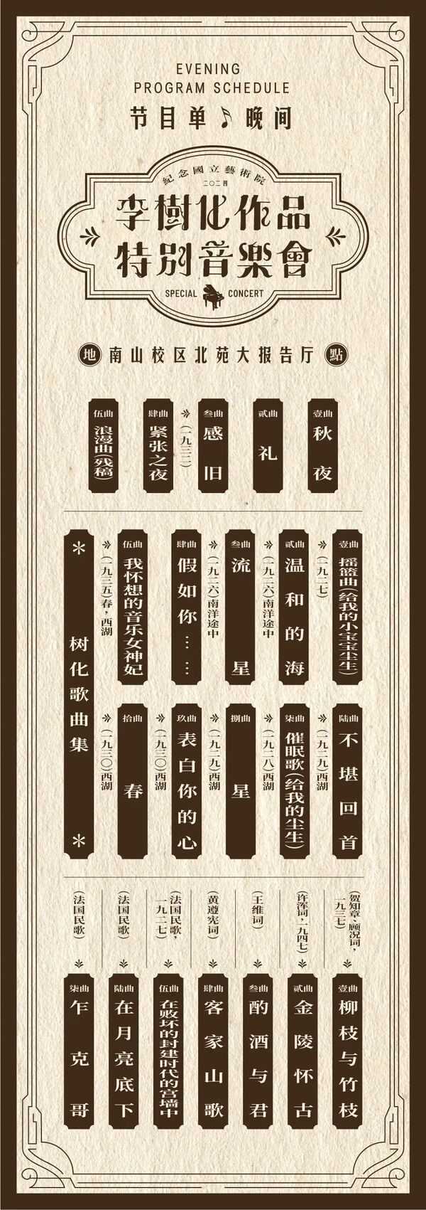 这是一场注定载入中国美术学院校史的音乐会——中国第一代钢琴家、作曲家李树化(1901-1991)先生重新回到了他参与创制的国立艺术院——观众在此追忆、重温国立艺术院的音乐,以及每一首乐曲背后的故事。